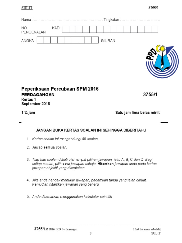 2016 Muka Depan Percubaan Perdagagan Kertas 1