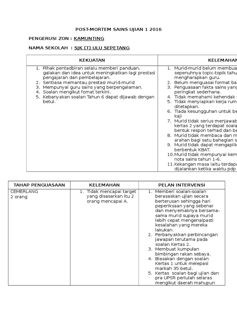 Post Mortem Ujian 1 Sains 2016